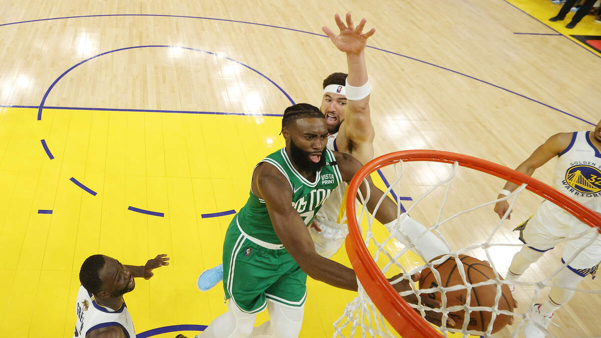 SAN FRANCISCO, CALIFORNIA - JUNE 02: Jaylen Brown #7 of the Boston Celtics shoots the ball against Klay Thompson #11 of the Golden State Warriors during the second half in Game One of the 2022 NBA Finals at Chase Center on June 02, 2022 in San Francisco, California. NOTE TO USER: User expressly acknowledges and agrees that, by downloading and/or using this photograph, User is consenting to the terms and conditions of the Getty Images License Agreement. (Photo by Ezra Shaw/Getty Images)Photo: Getty Images