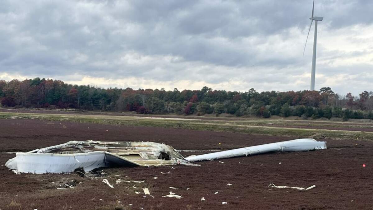 Plymouth Fire Chief Neil Foley says a blade from the 300-foot-tall structure in the area of Head of the Bay Road fell and landed in a cranberry bog on Friday.